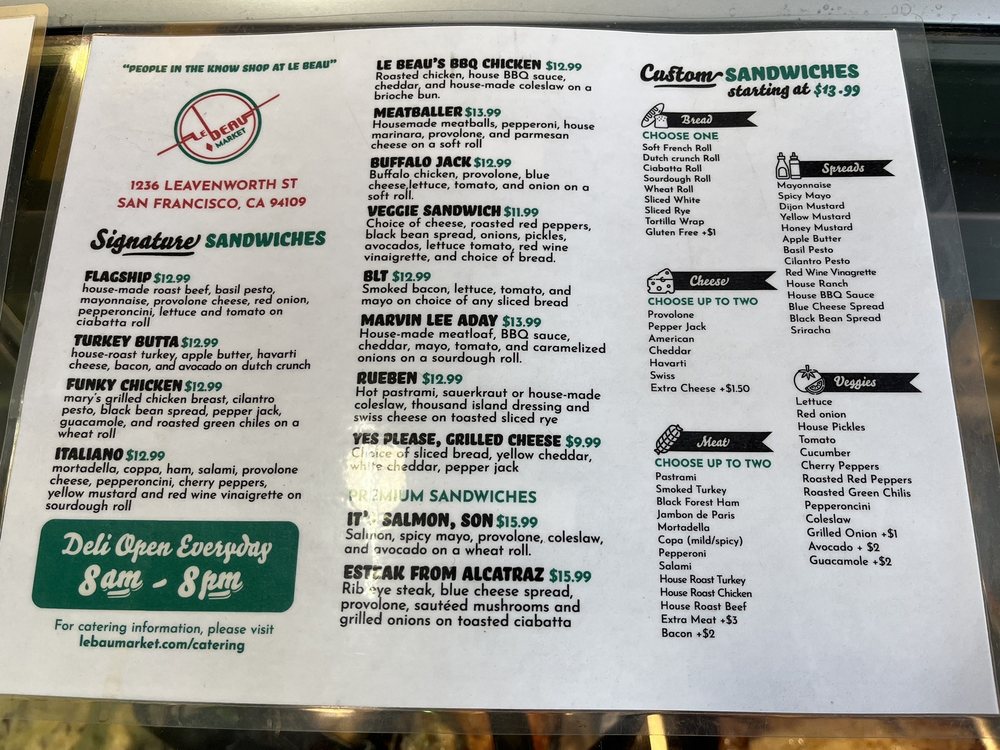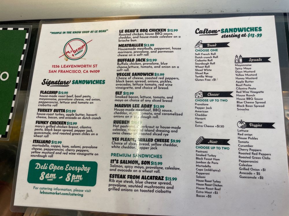 Welcome to Le Beau Market, a delightful deli nestled in the heart of Nob Hill, San Francisco. This vibrant market is much more than just a grocery store; it's a culinary haven offering an impressive array of international foods and fresh produce. From delicious deli sandwiches—like the popular "Italian" and "Funky Chicken"—to high-quality seafood options such as smoked salmon, Le Beau Market impresses with its commitment to quality.